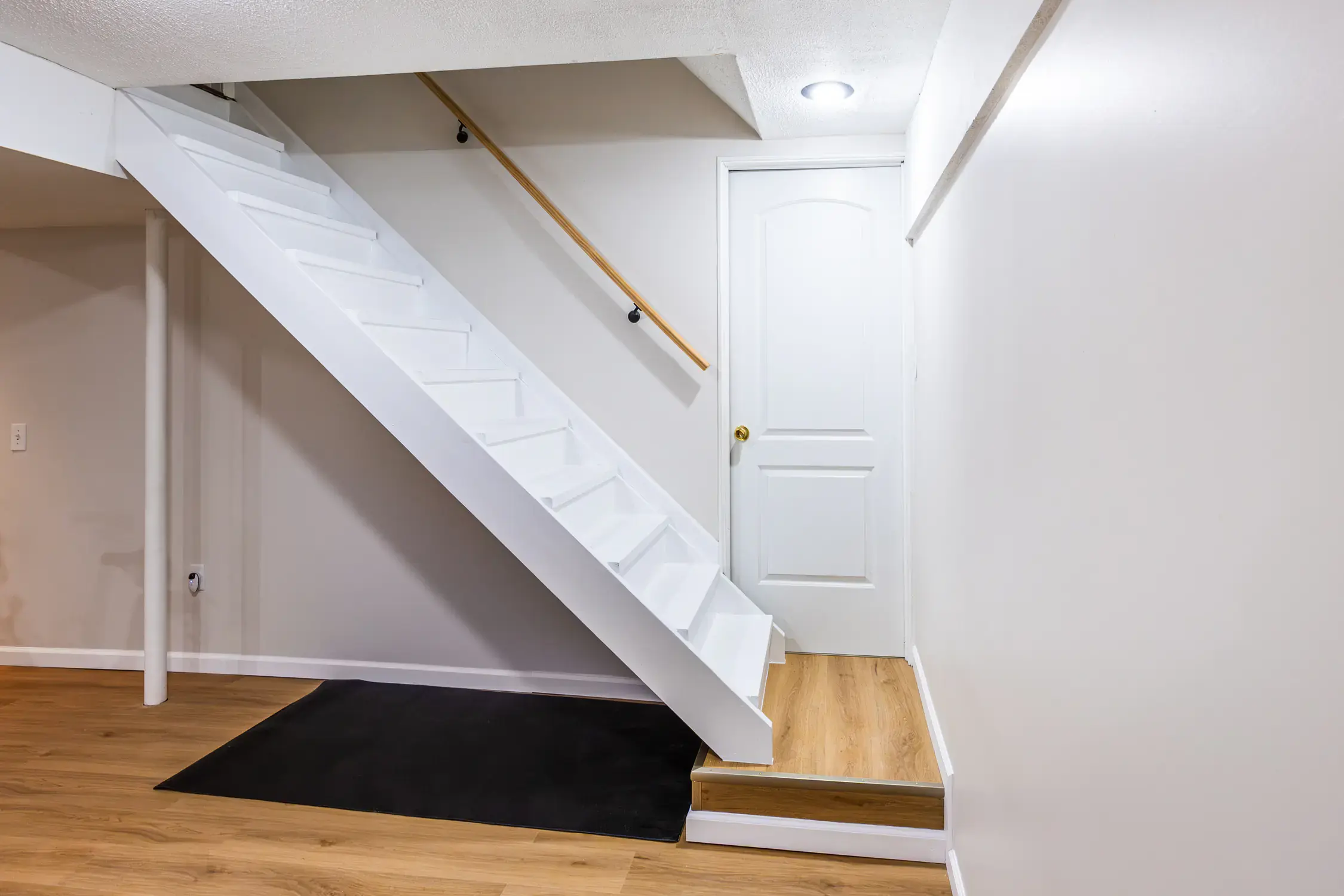 Our team completed a full basement renovation, starting with framing, insulation, and drywall to create clean, finished walls throughout. We installed new flooring for durability and warmth, added recessed lighting to evenly illuminate the space, and refreshed the staircase with updated finishes and a clean, modern look.