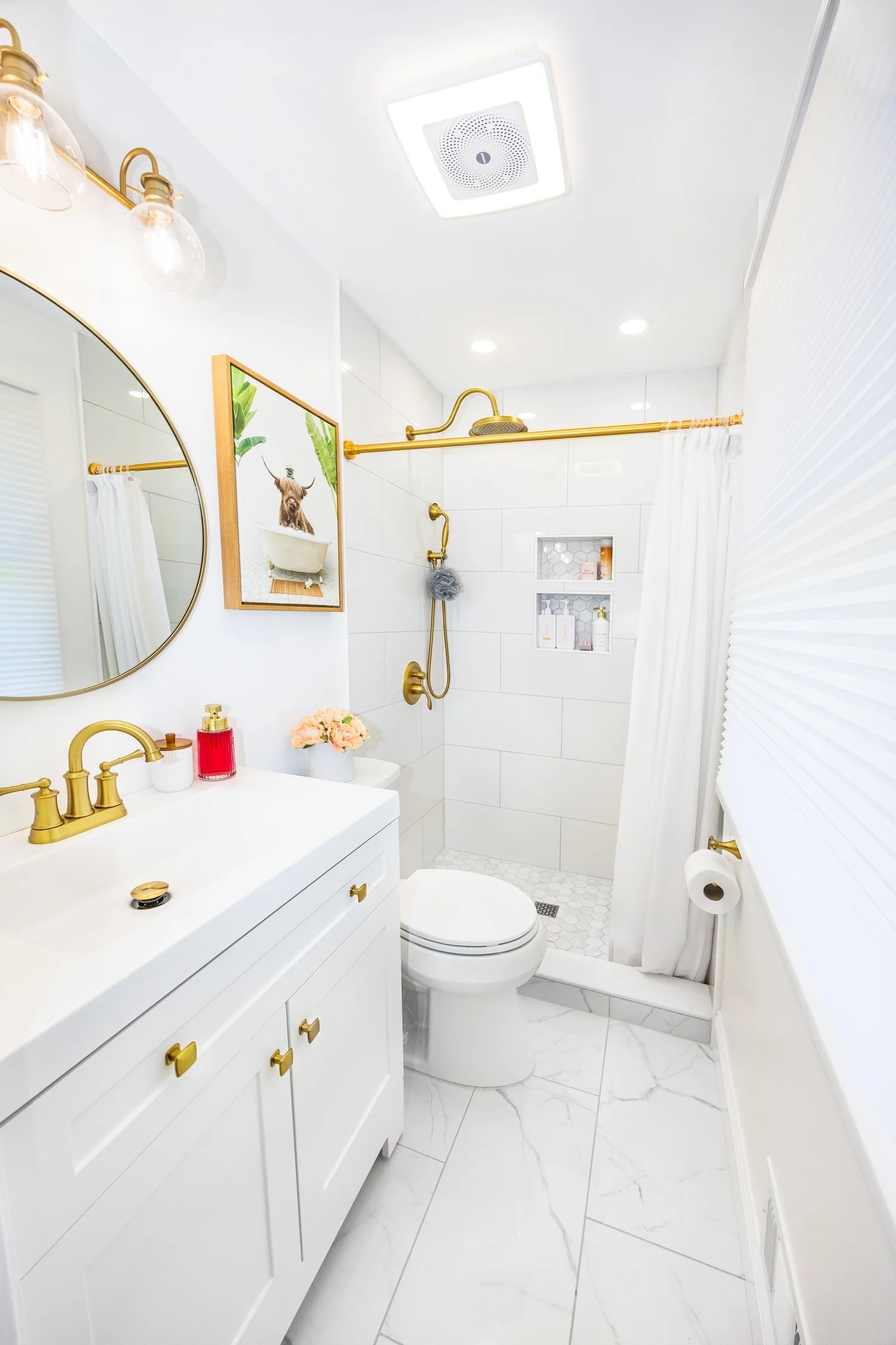 We redesigned the bathroom with a walk-in shower featuring large white tiles, a mosaic tile shower floor, and built-in niches for convenient storage. The gold fixtures—from the rain shower head to the vanity faucet and cabinet hardware—add a touch of modern elegance and warmth against the clean white palette.