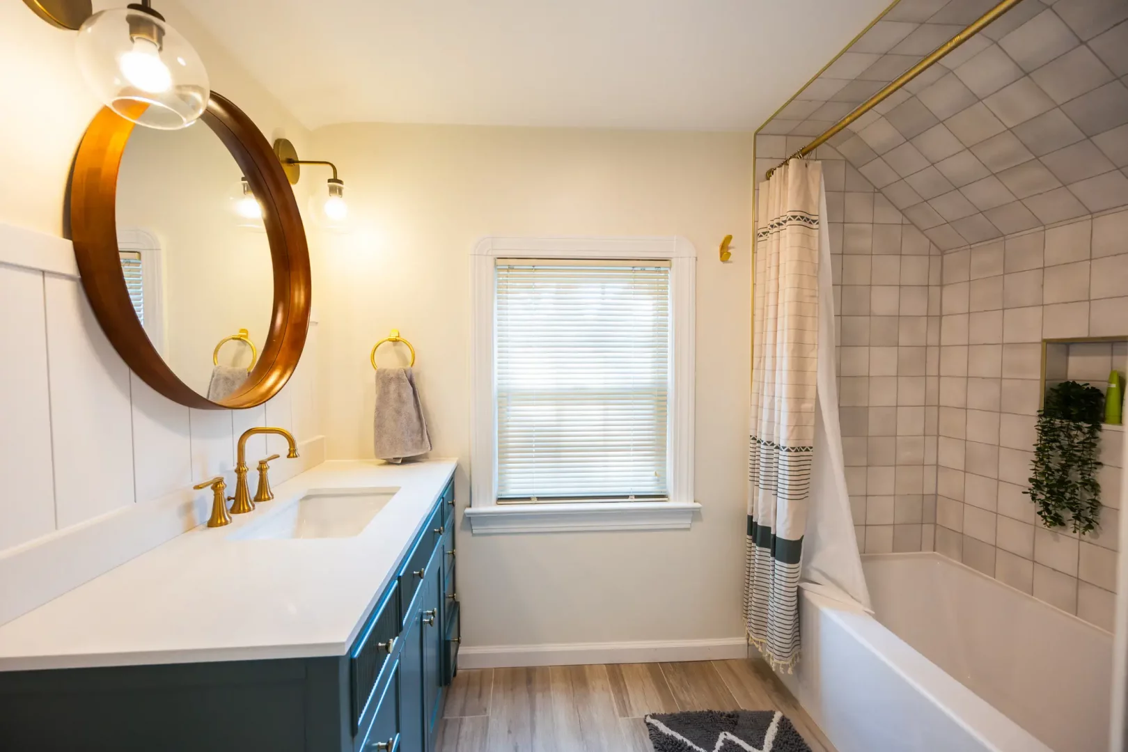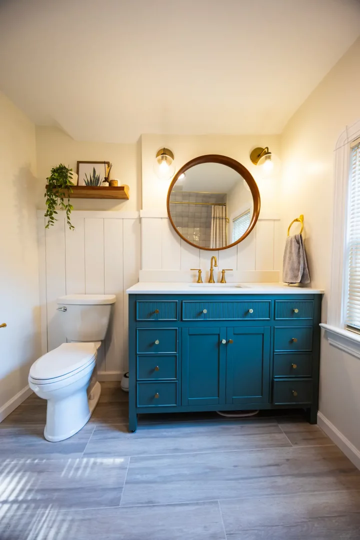 The centerpiece of the renovation is a custom teal vanity with ample storage, paired with gold fixtures for a touch of modern elegance. A round mirror and updated lighting create a warm and inviting atmosphere. In the shower area, we installed subway-style tile with a built-in niche, framed with gold accents for both practicality and style.