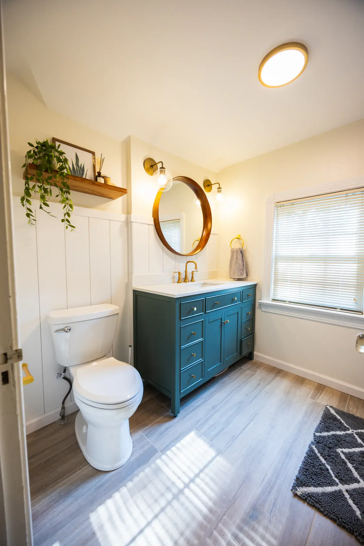 The centerpiece of the renovation is a custom teal vanity with ample storage, paired with gold fixtures for a touch of modern elegance. A round mirror and updated lighting create a warm and inviting atmosphere. In the shower area, we installed subway-style tile with a built-in niche, framed with gold accents for both practicality and style.
