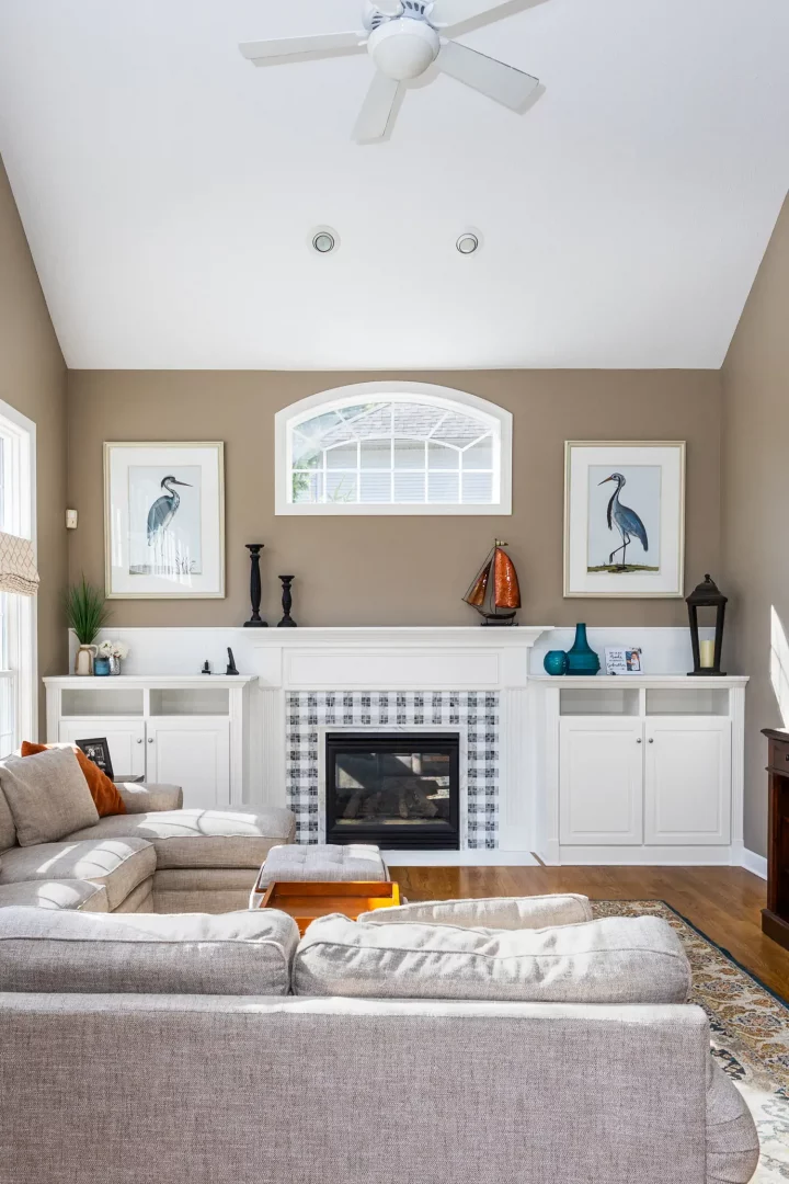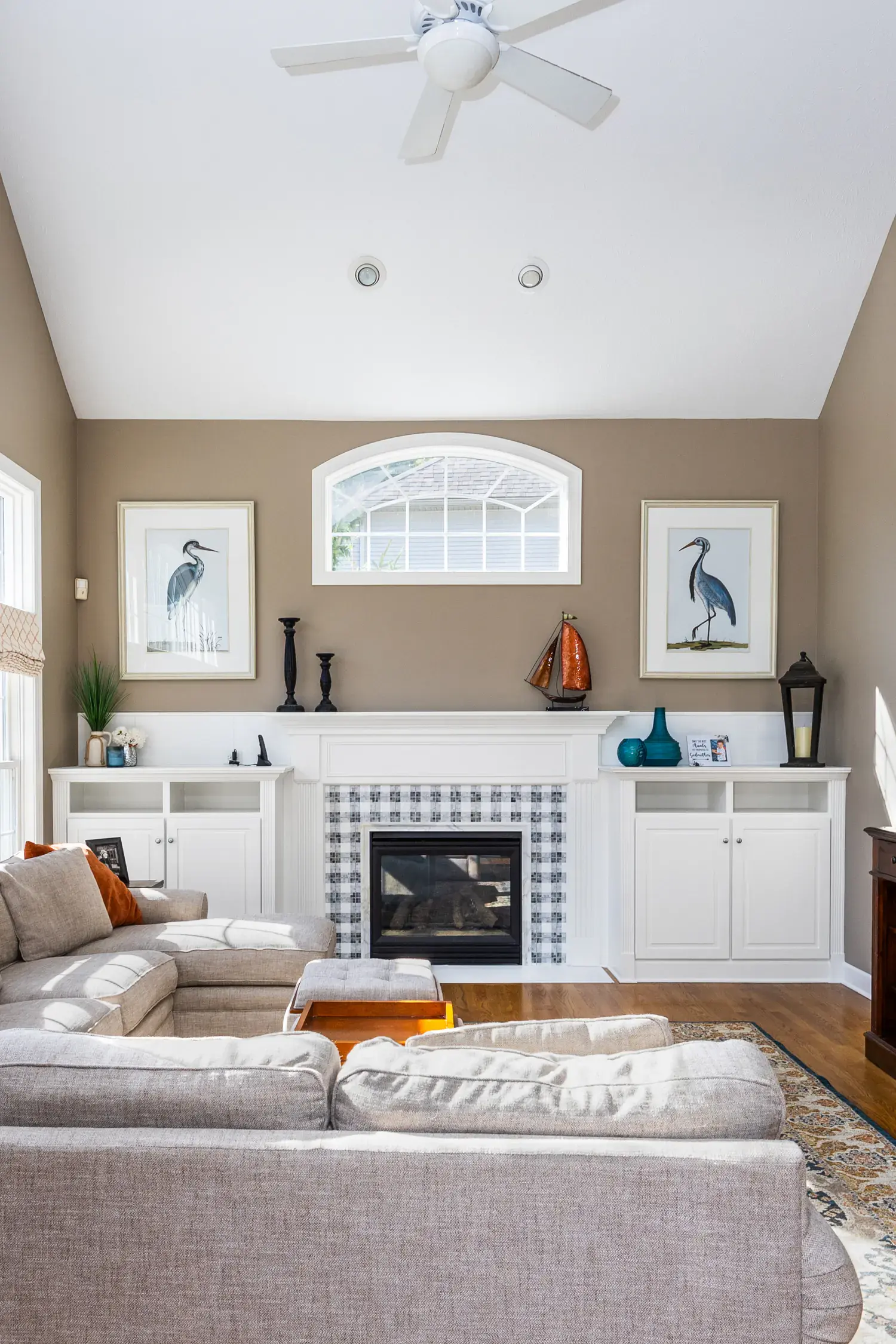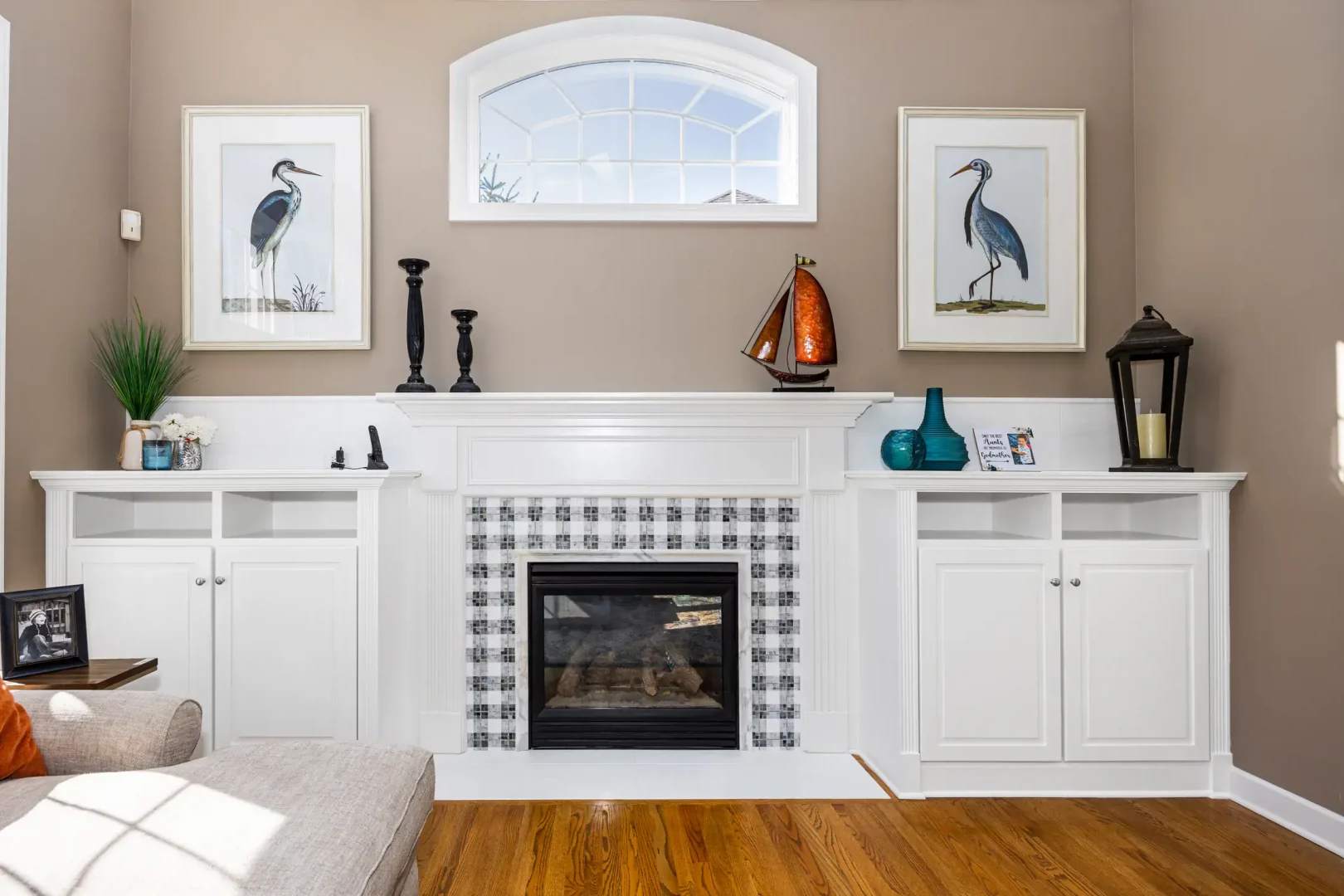 Working alongside Sara Harrison, our team handled the demolition, preparation, and rebuild of the fireplace wall and surrounding cabinetry. The project included refinishing the mantle, updating the tile surround with a patterned ceramic, and enhancing the built-ins with new finishes and styling details that complement the designer’s vision.